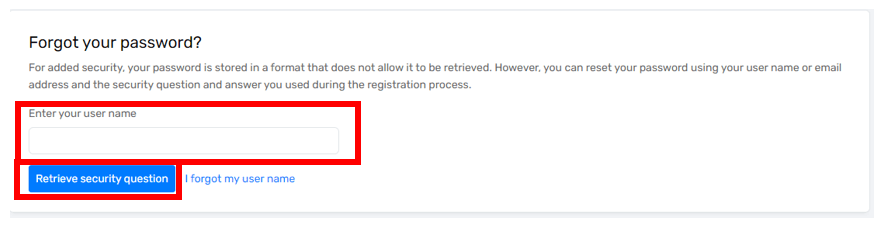 2. On the next page, enter your user name and click “Retrieve security question”