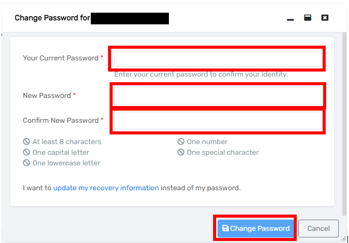 Enter your current password, and new password twice in the pop-up. Then click ‘Change Password.’