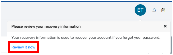 1. To set your security question and password you can either click on ‘Review it now’ in the pop-up that appears when you first log in.